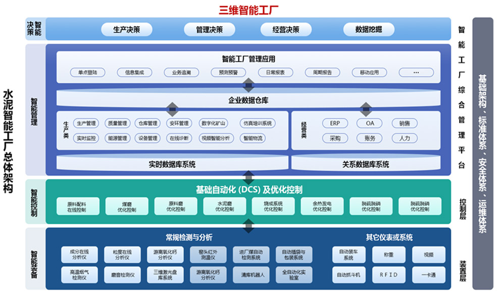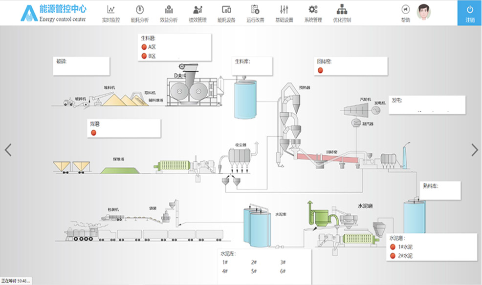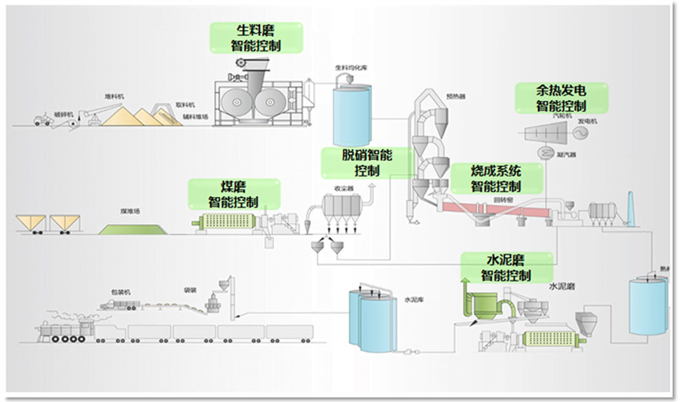 建设了涵盖从生料、煤磨、烧成、水泥磨、余热发电各个过程的智能控制系统,从生产管理和生产操作着手,稳定生产优化工况,实现高产低耗,提高劳效和绩效,实现生产效益最大化。