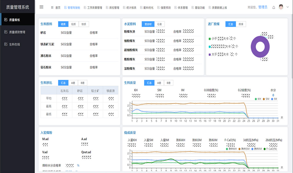 利用质量管理系统进行生产过程管理,以质量管理业务为主线,对进厂的原燃料及生产的矿石、入磨生料、熟料、水泥等进行质量检测、分析和控制,保证产品的质量的可靠性和稳定性。