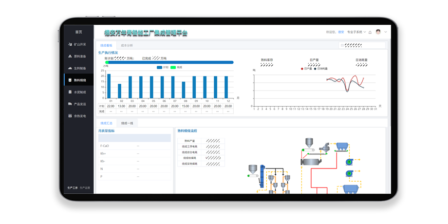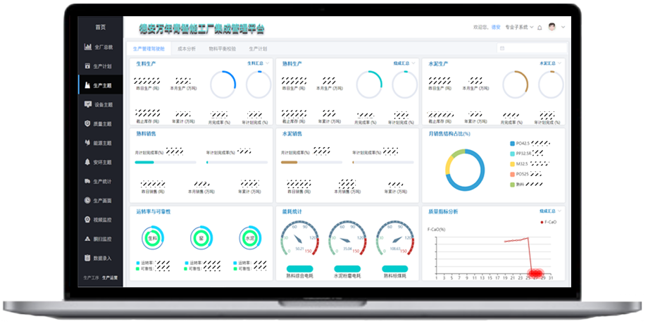 以生产实时数据为基础,同能源管理、质量管理等子系统相融合将矿山、生料、熟料、水泥的的生产计划、实际生产数量及其质量、能源消耗、台时等数据清晰直观的展现在管理者面前,数据会根据实际生产进行实时刷新,从而确保数据的真实有效性。通过生产数据为支撑建立以质量、效率(台时、运转率)、能源为核心的绩效考核指标体系,达到降本提效的目标。